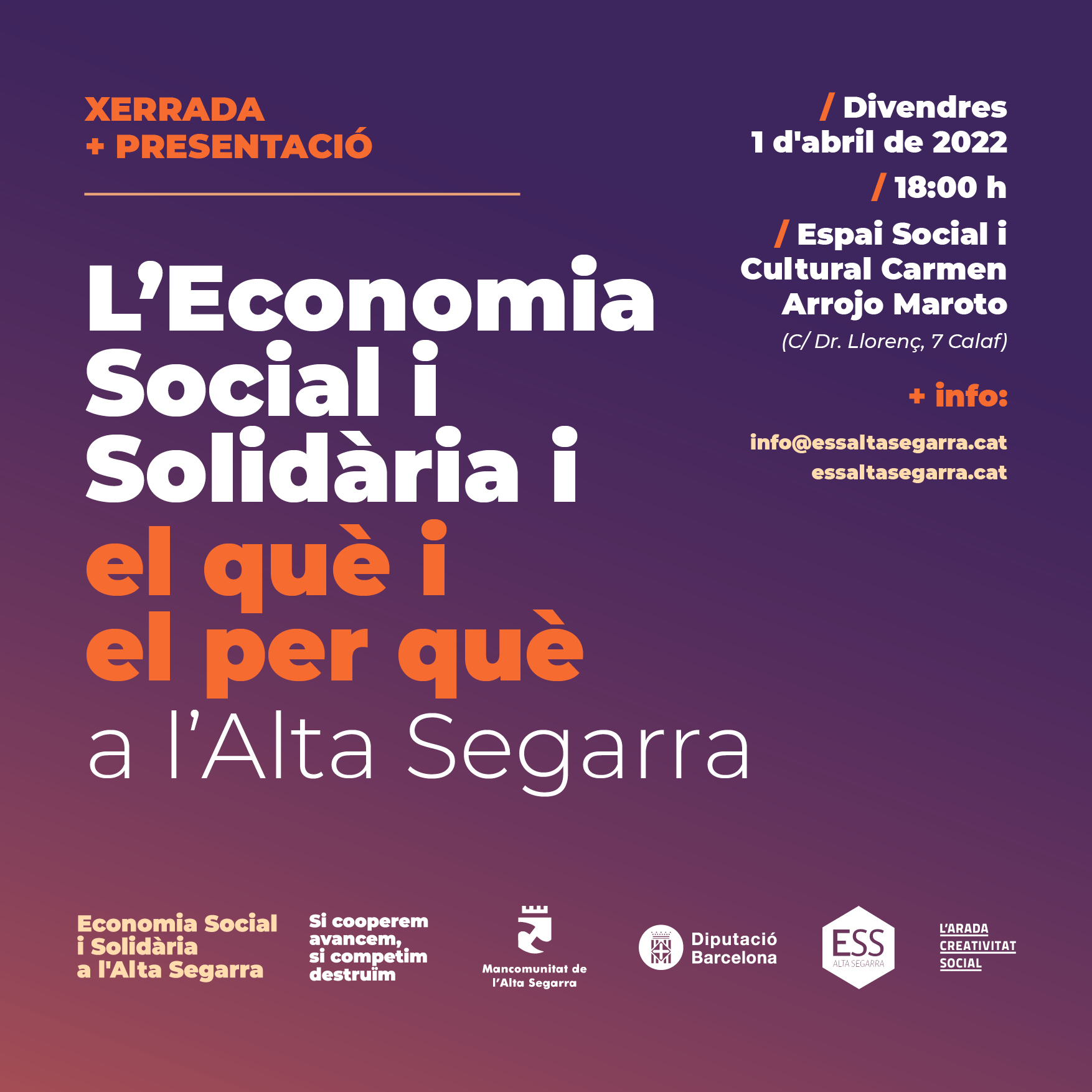 📅Divendres 1 d’abril, presentació a la ciutadania del projecte ESSAS a l’espai cultural Carmen Arrojo Maroto, a Calaf, a les 6:00 de la tarda