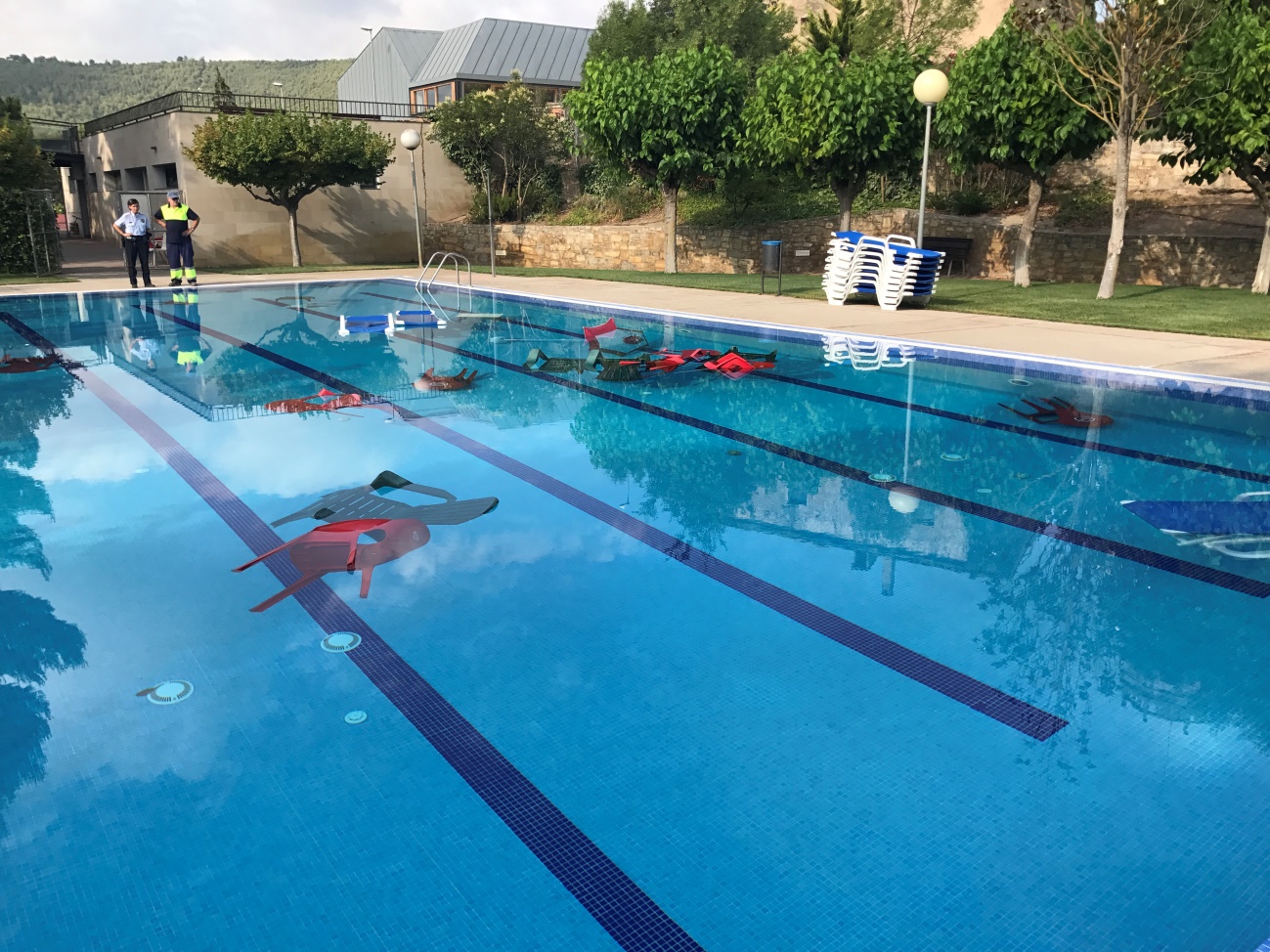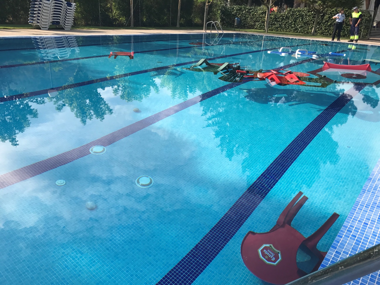 Avui no és segur que la piscina es pugui obrir a les 12h fins que la policia científica i les investigacions acabin i es pugui retirar el mobiliari de la piscina de dins del vas principal.