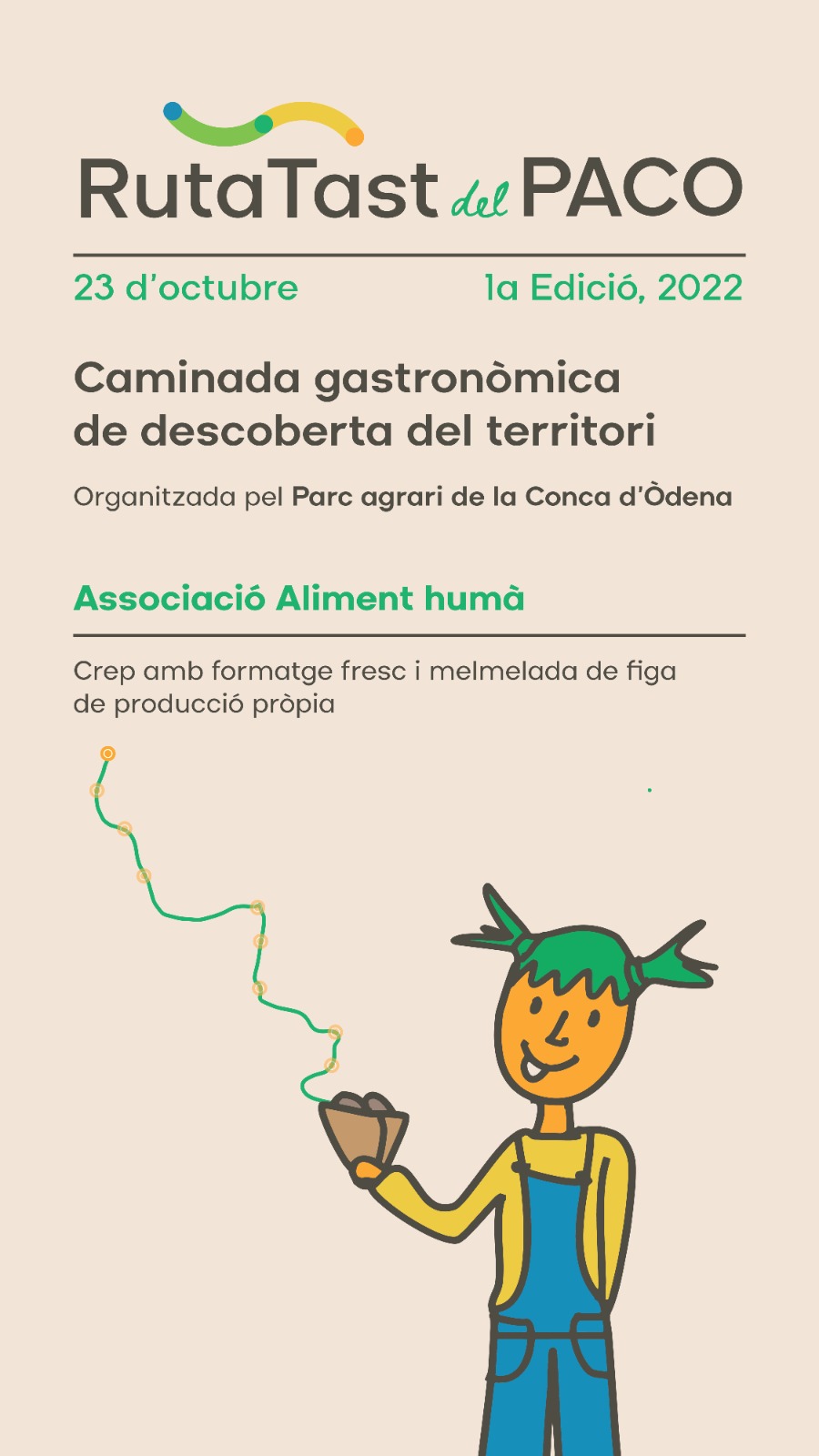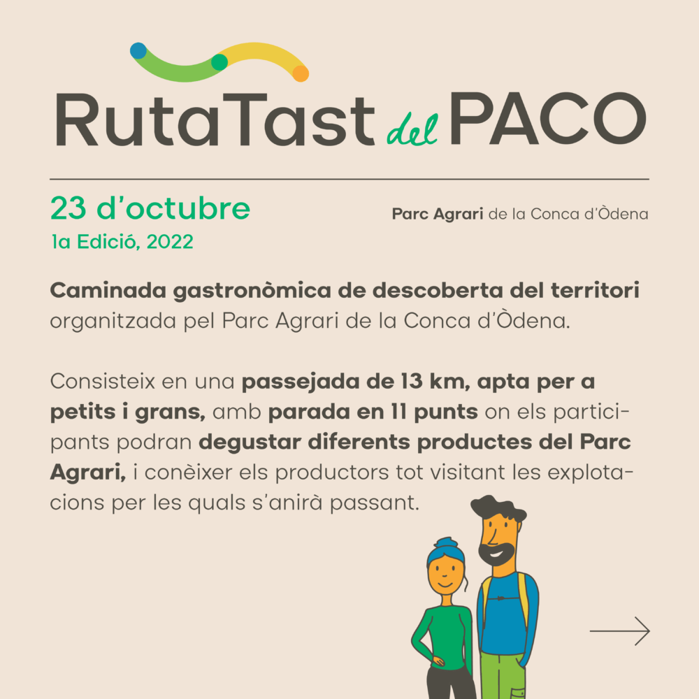 El diumenge 23 d’octubre, el Parc Agrari de la Conca d’Òdena celebra la 1a edició de la RutaTast del PACO. Es tracta d’una caminada gastronòmica de descoberta del territori organitzada pel Parc Agrari de la Conca d’Òdena.