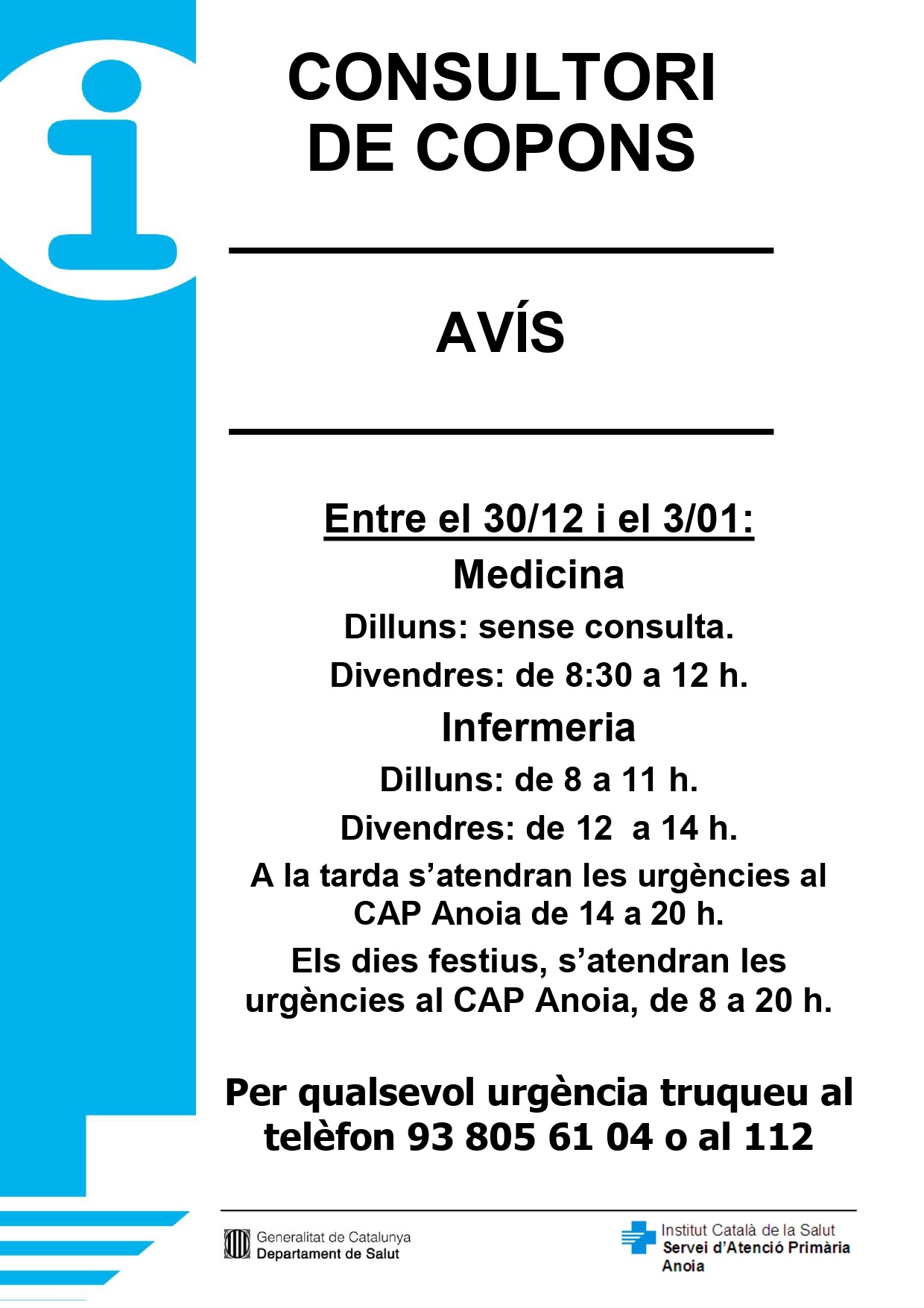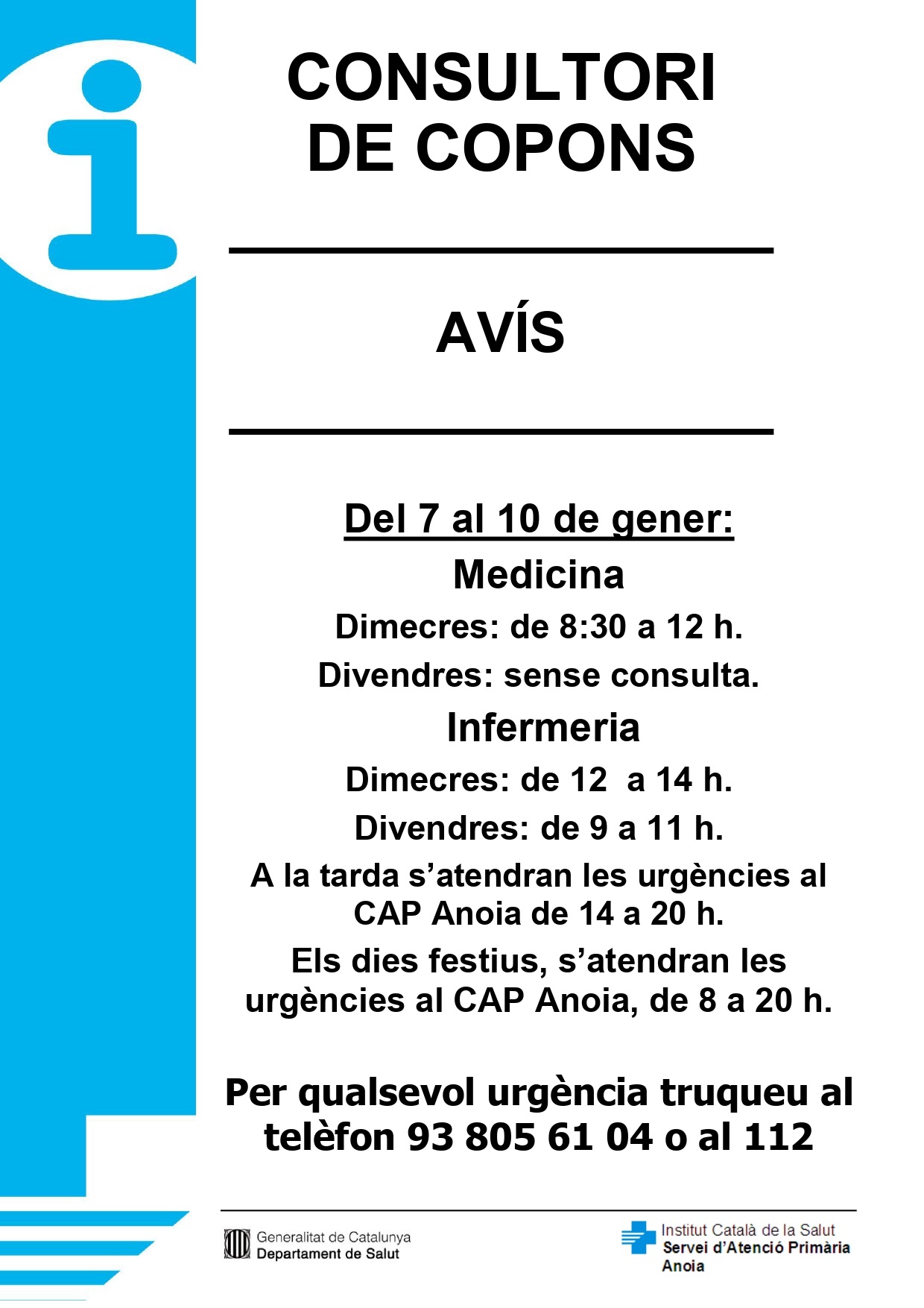 Horaris del consultori mèdic del 2 al 10 de gener