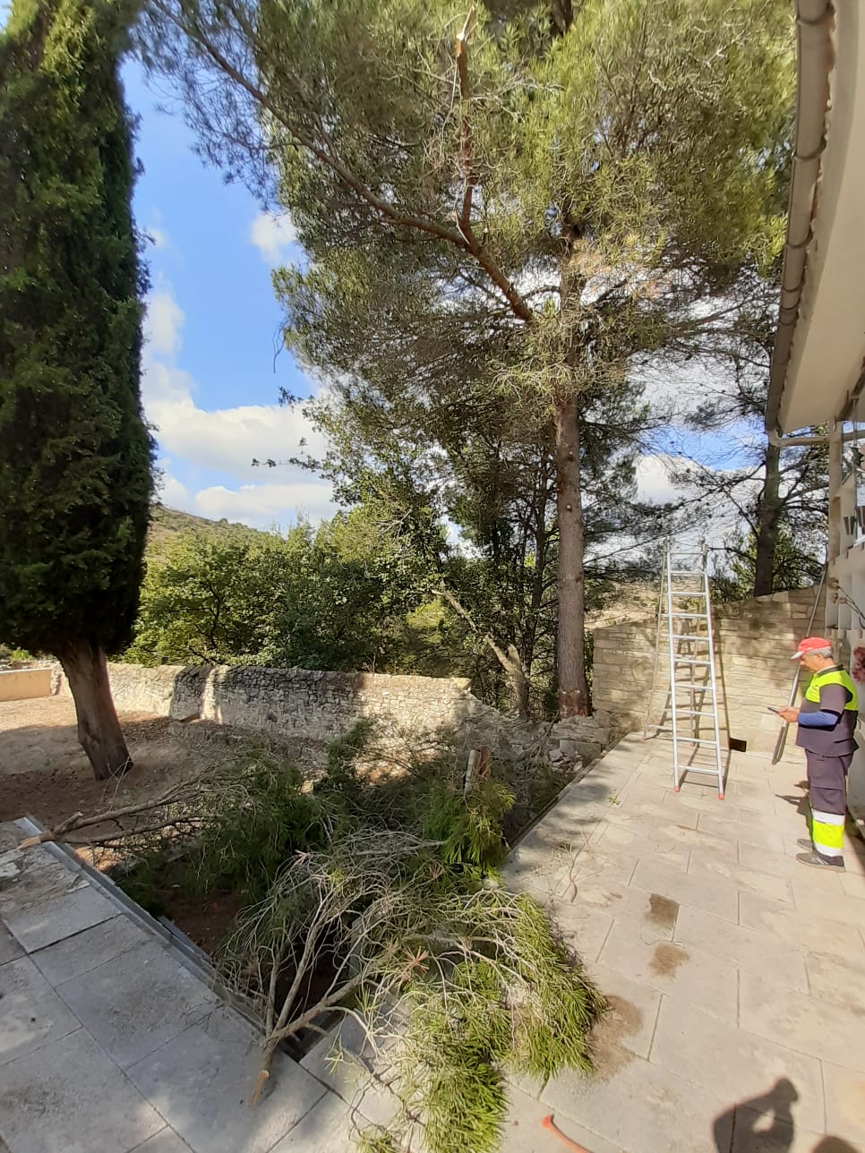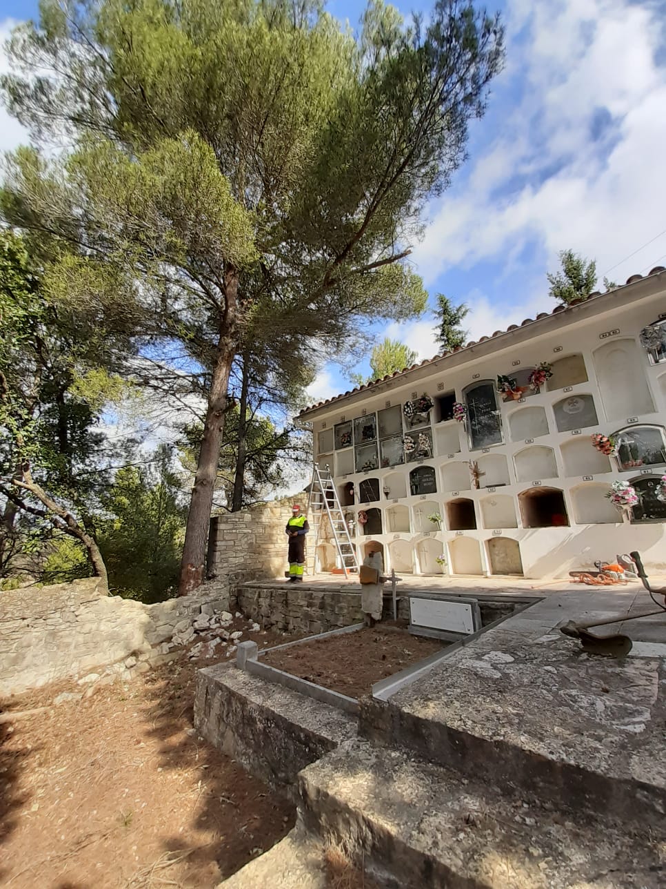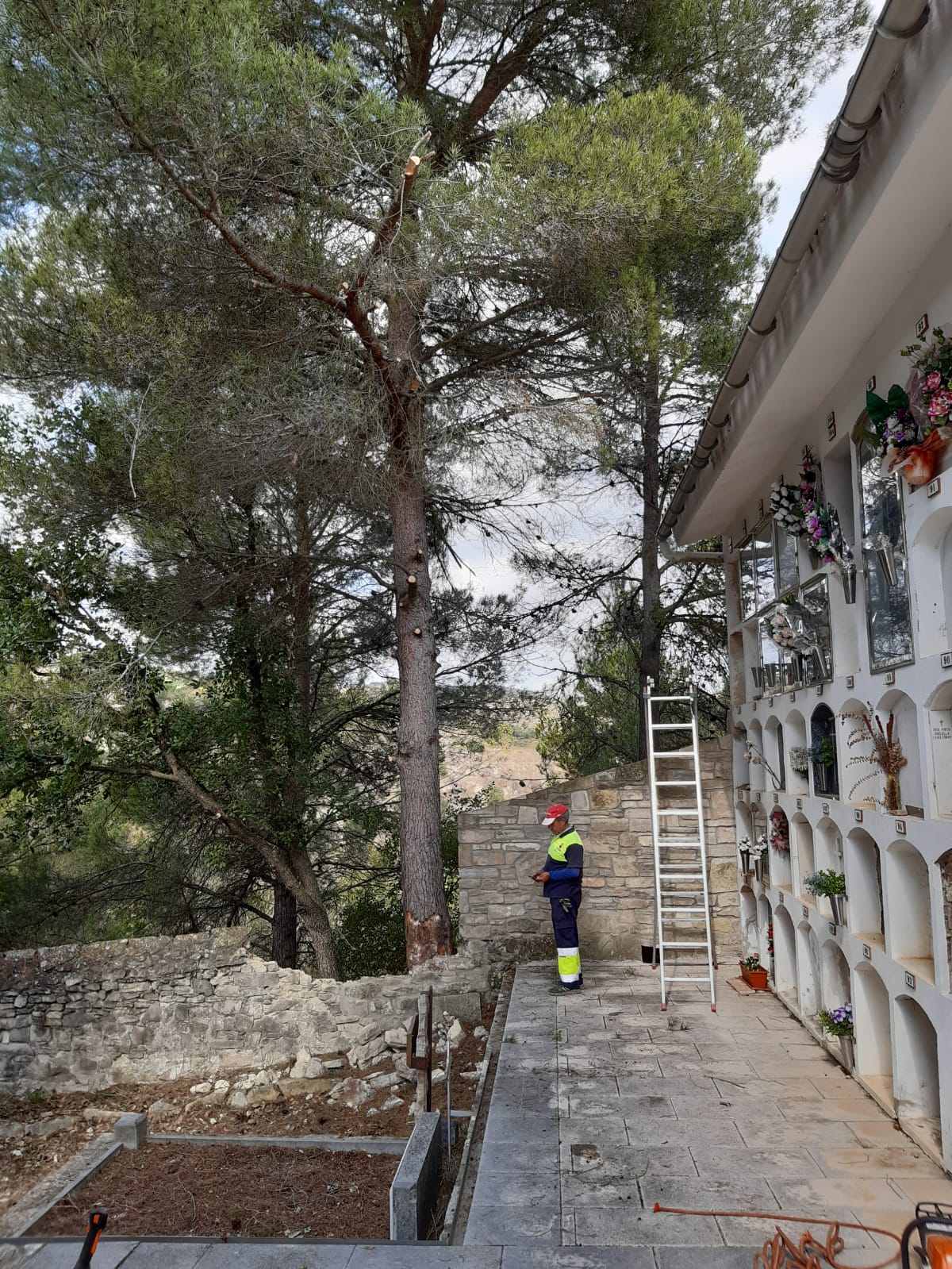 La setmana passada la brigada municipal va realitzar feines de neteja i poda d’algunes branques dels arbres del cementiri en vistes a la propera festivitat de Tots Sants.
