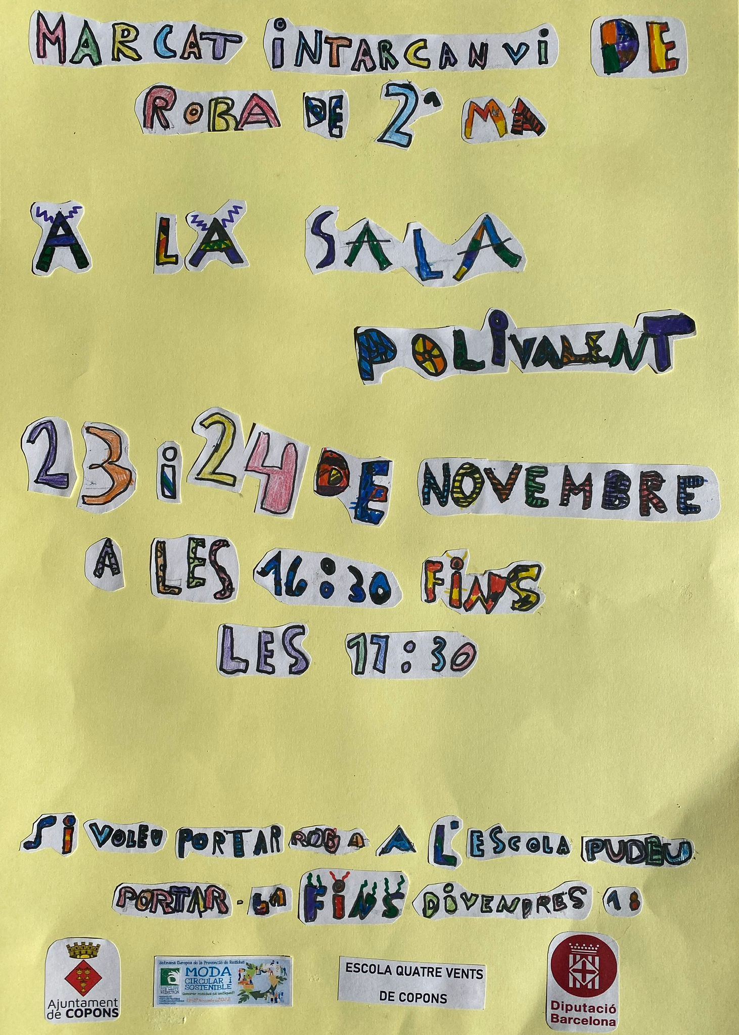 ✅Des de l’Escola Quatre Vents de Copons s’ha organitzat un Mercat d’intercanvi de roba de 2ª mà. El dimecres 23 i el dijous 24 podreu participar-hi a la sala polivalent de les 16:30 fins les 17:30h