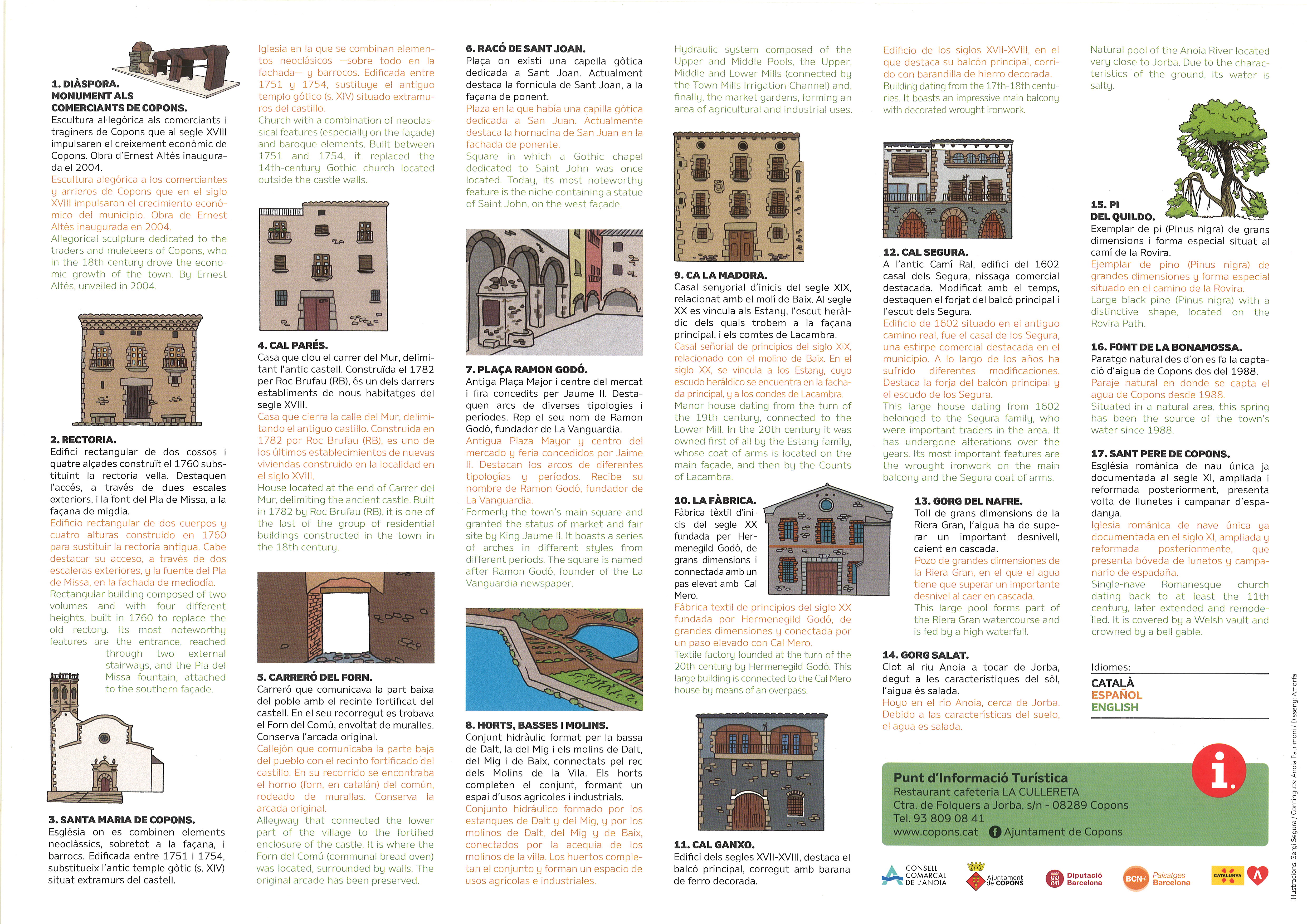 Al segle XVIII els comerciants i negociants de Copons viatjaren per totes les fires i mercats espanyols fundant autèntics imperis comercials i financers que, per una banda enriquiren el poble, però per l’altra el buidaren d’homes, convertint-lo en “el poble de les amazones”. D’aquesta diàspora i creixement econòmic en trobem nombroses mostres en un entorn natural privilegiat, espais i cases que amaguen els detalls d’aquesta història sorprenent i que podrem recórrer i descobrir en les visites guiades que us hi oferim cada segon diumenge de mes.